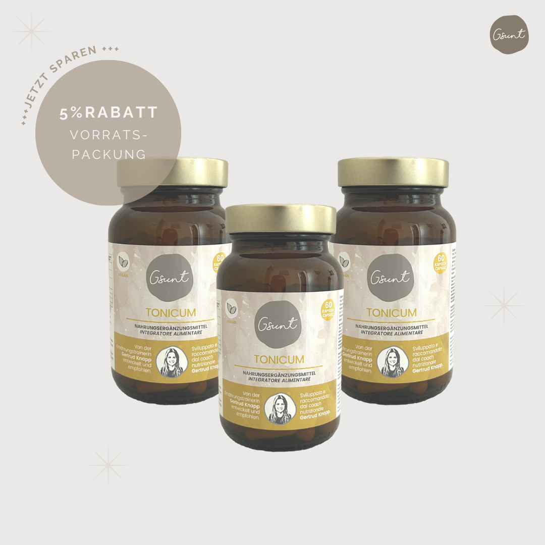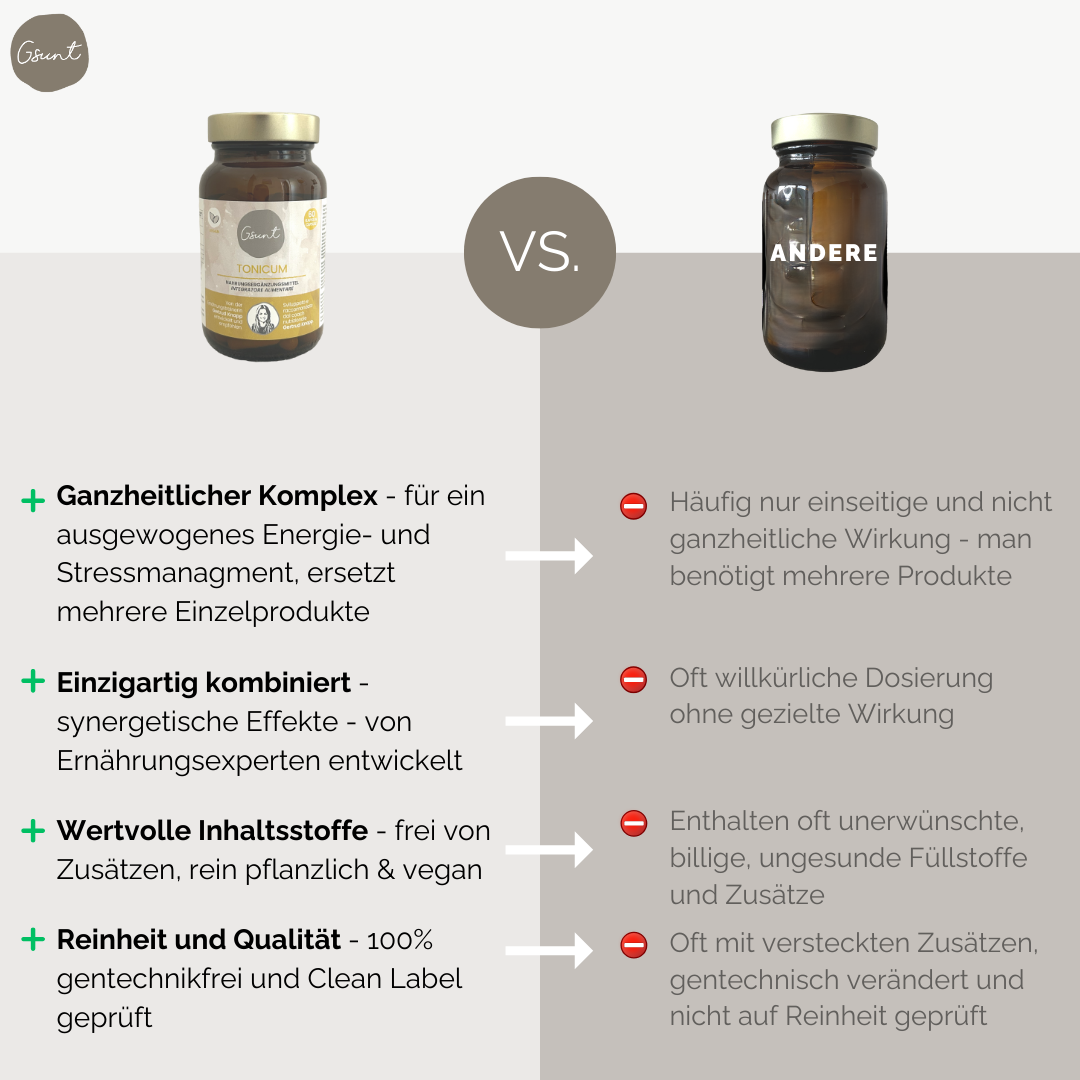 Ideal für stressige Phasen, mentale Herausforderungen und Energielosigkeit. Mit GSUNT Tonicum findest du zurück zu Ruhe und Stärke, ausgeglichen, fokussiert und energiegeladen zugleich.🌿